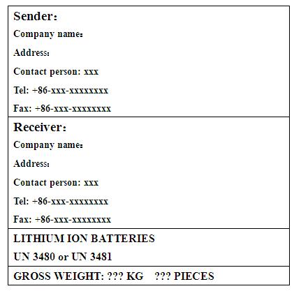 唛头尺寸: 100*100mm | 如是危险品出货, 外箱贴上”电池操作标签”、“第九类危险品标识”和”唛头”三个标签 | ||